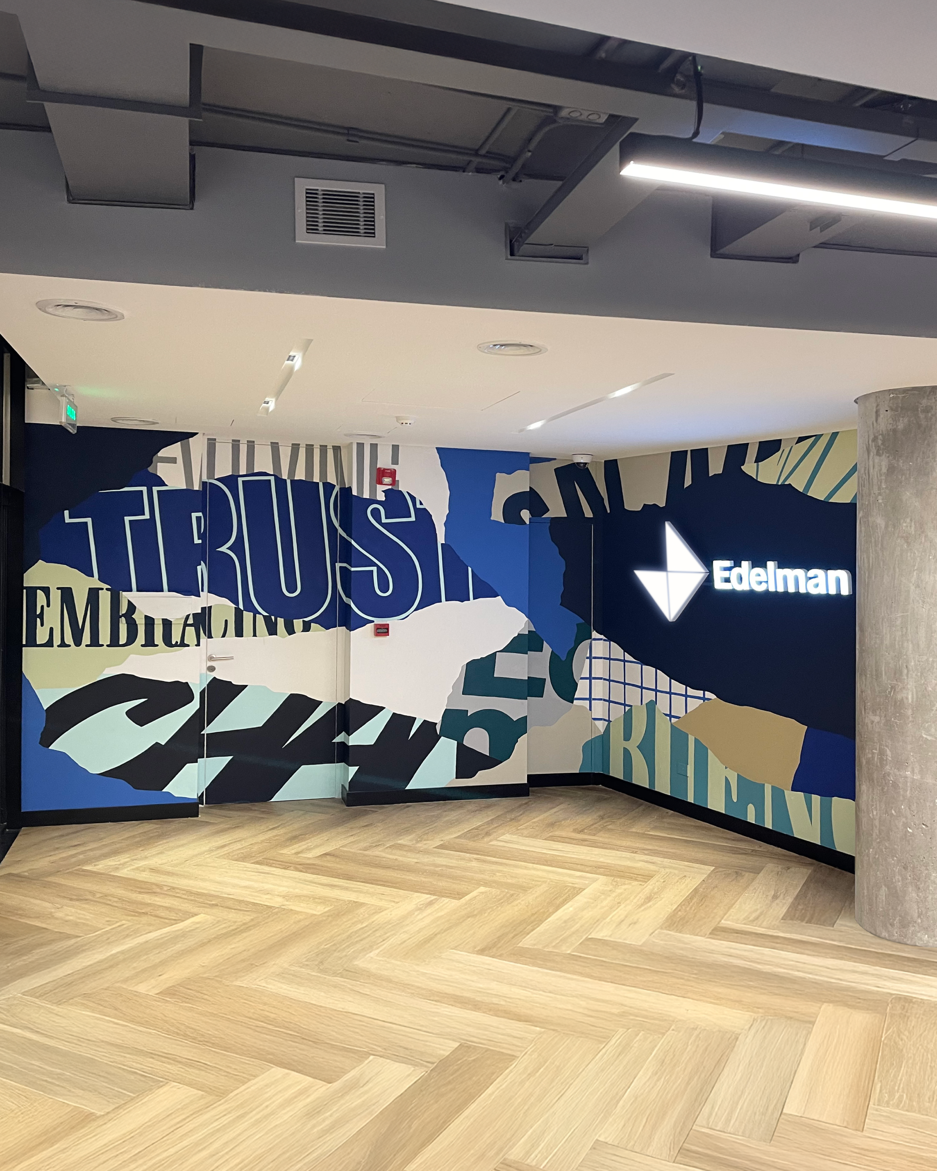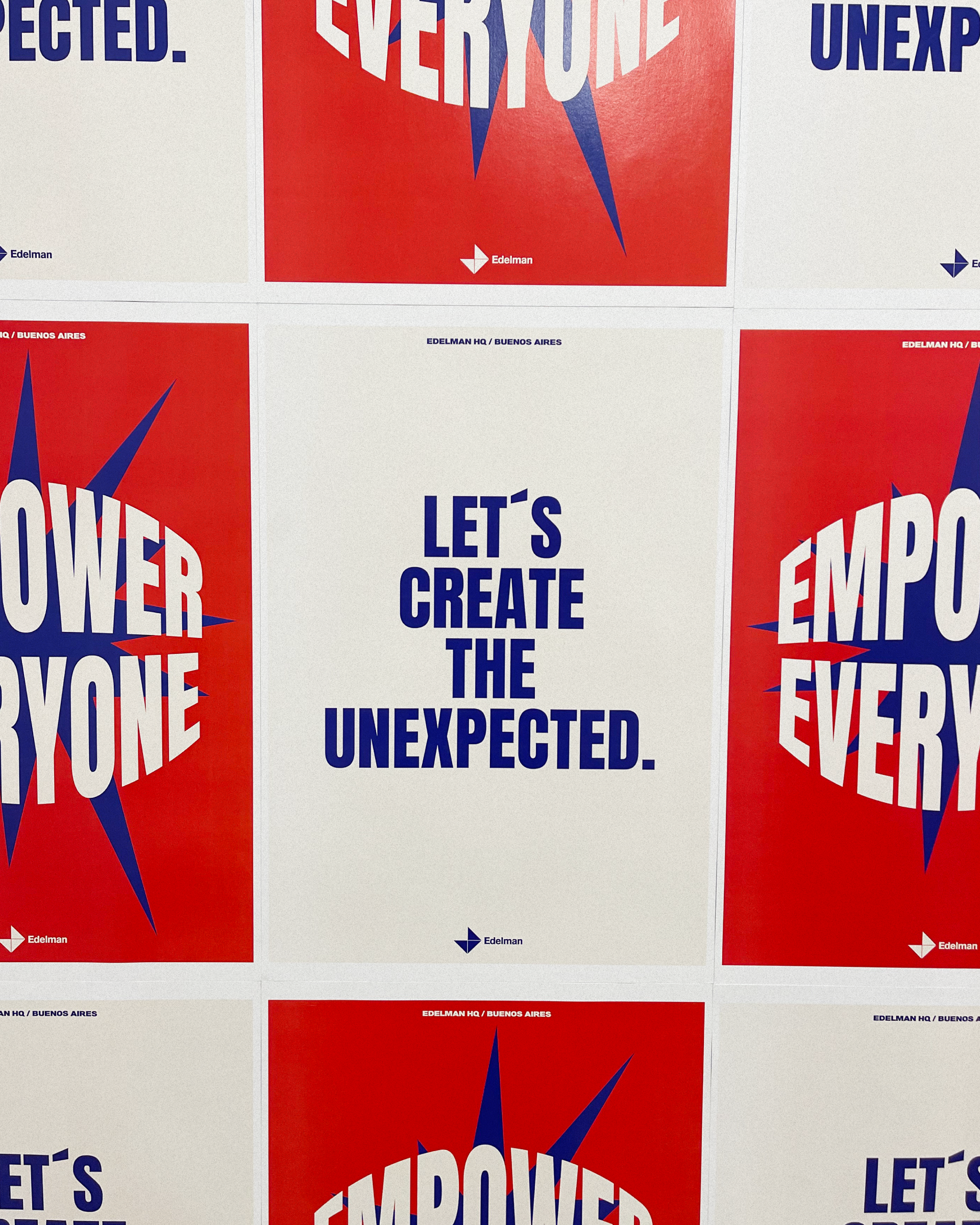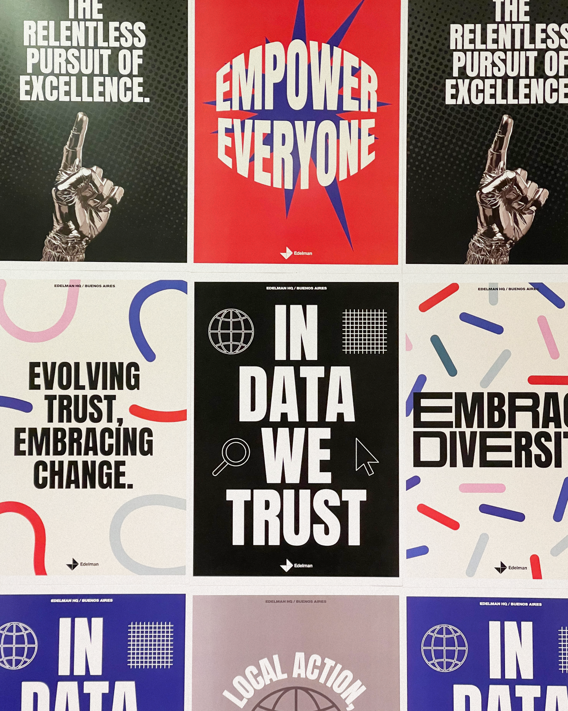 Mural interior y sistema de afiches diseñados y pegados en distintos espacios de trabajo dentro de las nuevas oficinas de Edelman en Palermo.