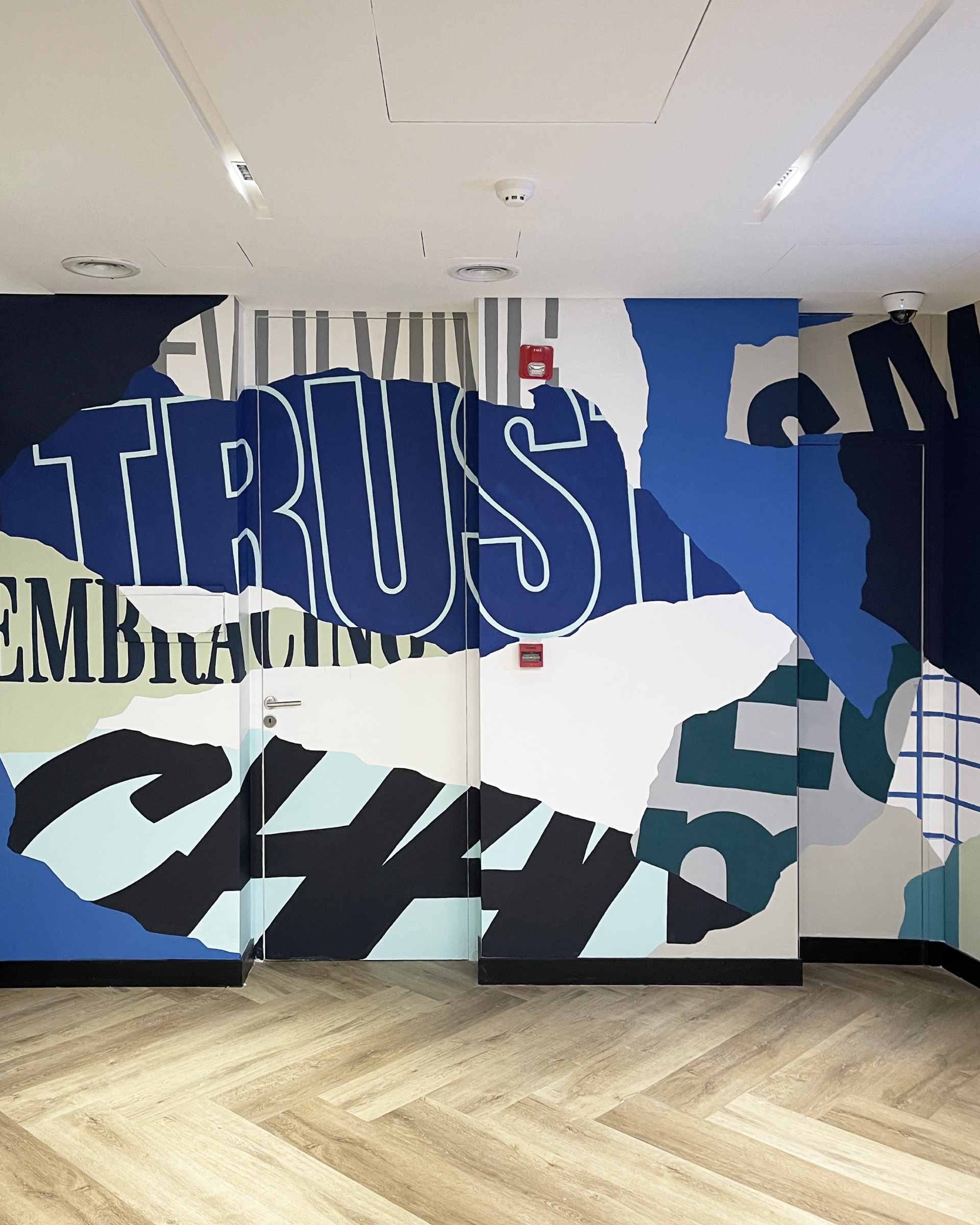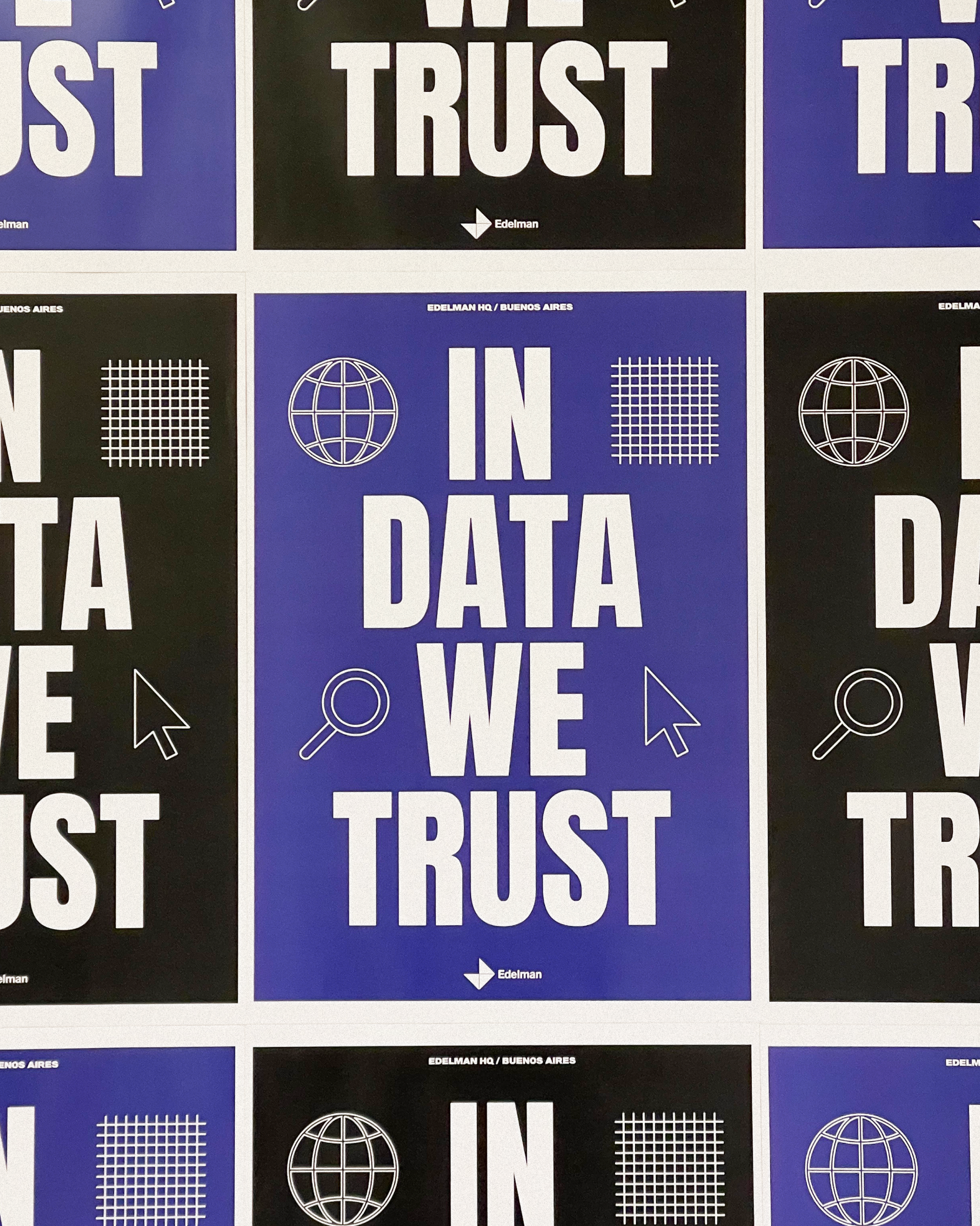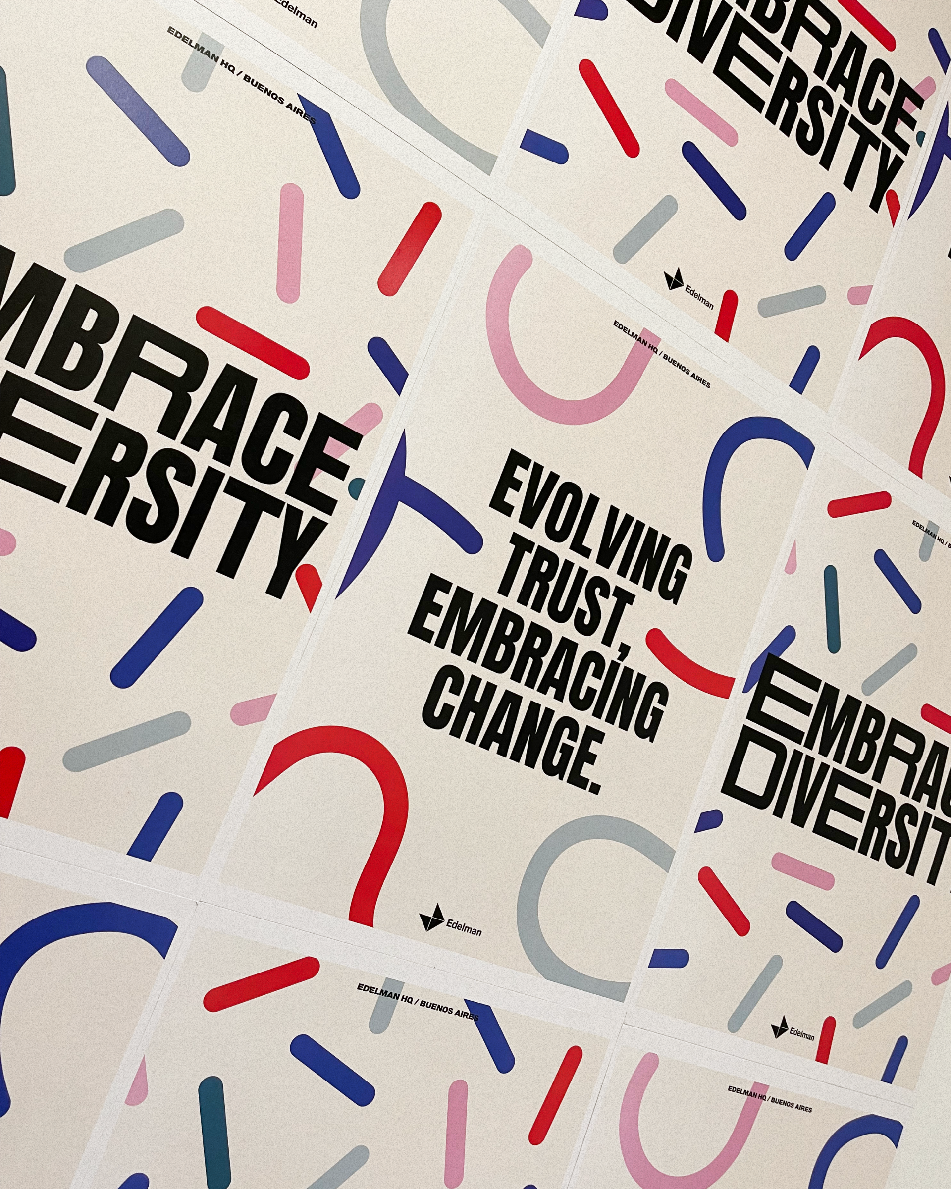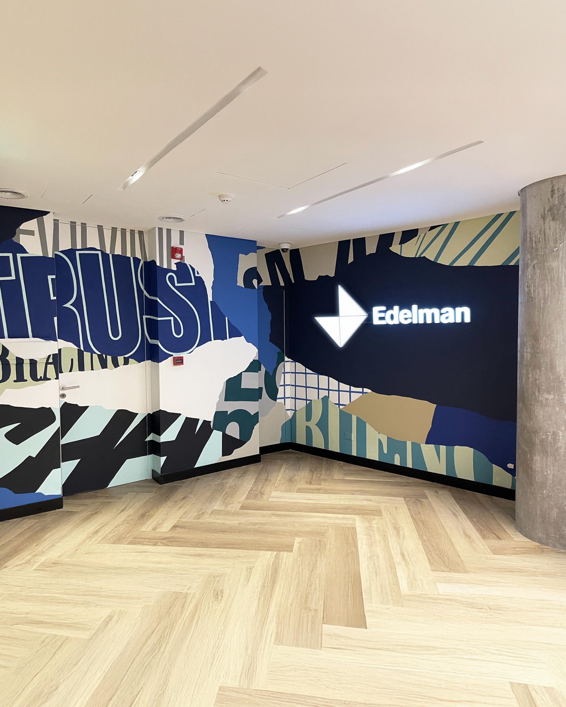 Mural interior y sistema de afiches diseñados y pegados en distintos espacios de trabajo dentro de las nuevas oficinas de Edelman en Palermo.